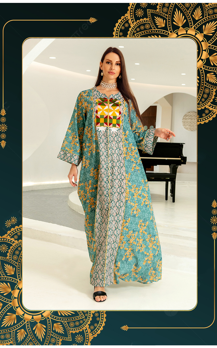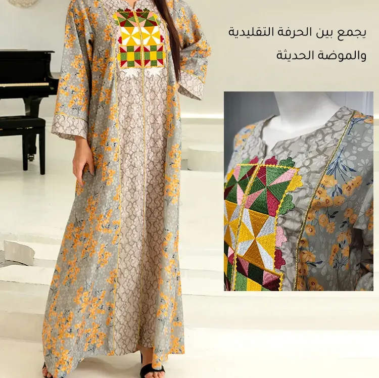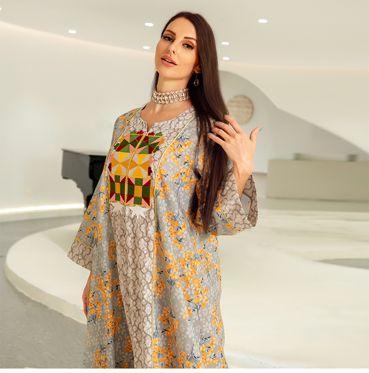الشرق الأوسط رباعي المواسم فستان قطني مطرز بالزهور للمسلمات